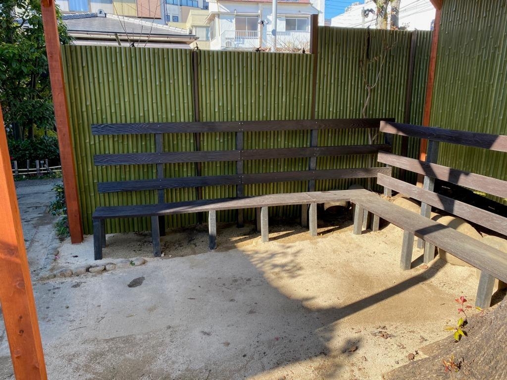 ベンチの材料は、木に見えますがプラスティック製の素材です。