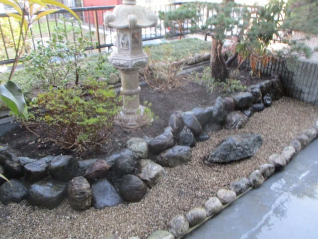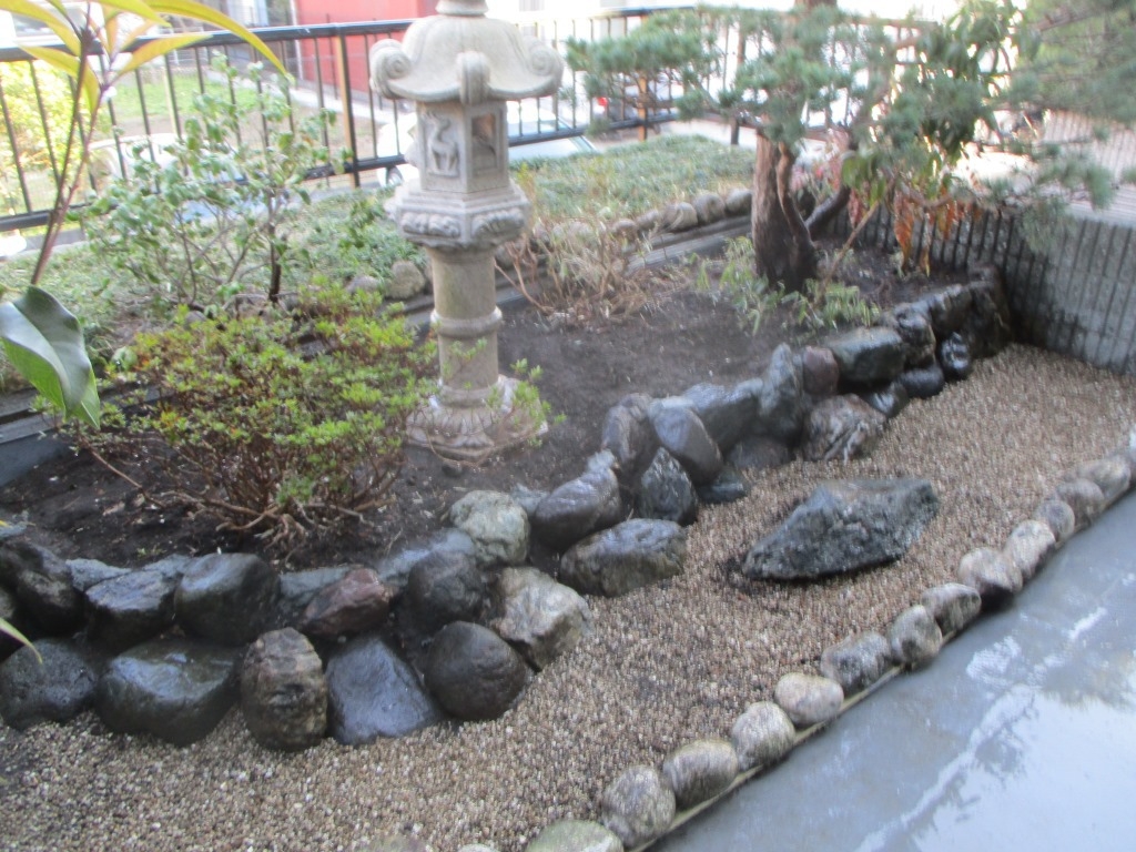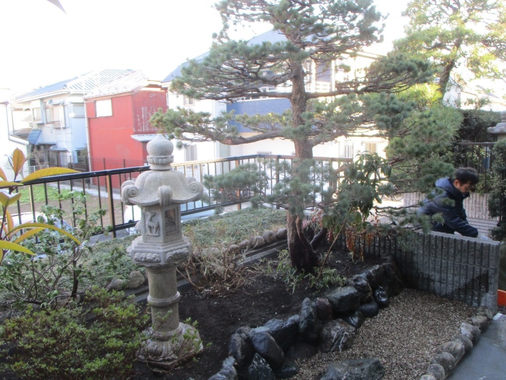 駐車場の上に、15年前に造った庭ですが、防水工事のため既存の植木、石、土をすべて撤去し、防水工事後にすべて戻すという