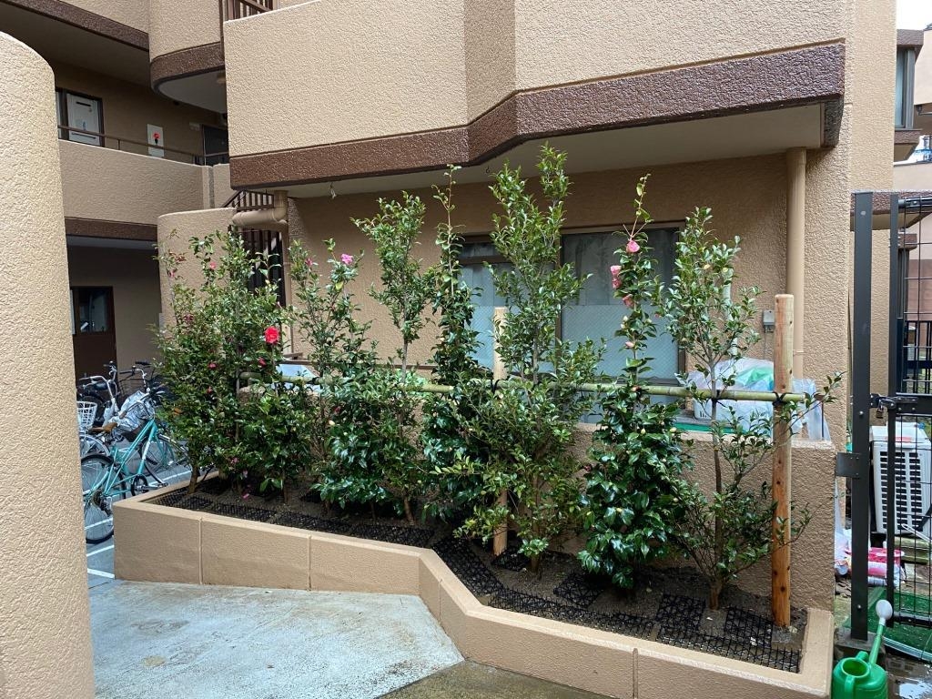 陽当たりが悪く、上に上に育ってしまうマサキを抜いて、ツバキとサザンカにしました。
