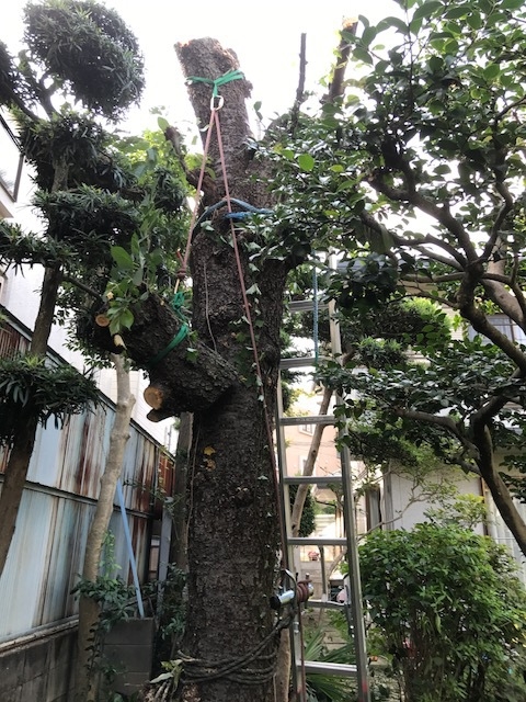 作業の際、周りに木々があるので折らないようにロープを使い安全作業です。